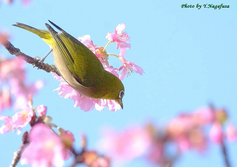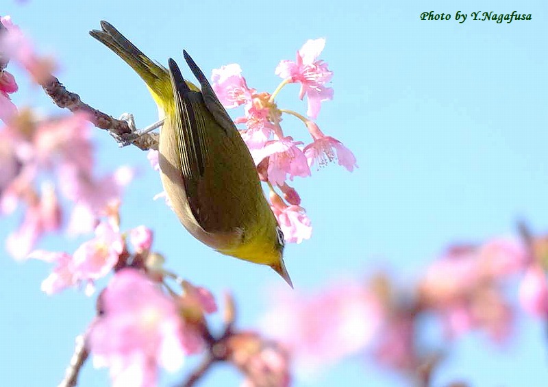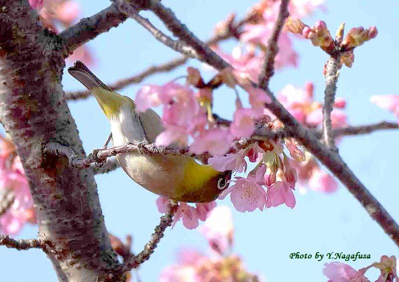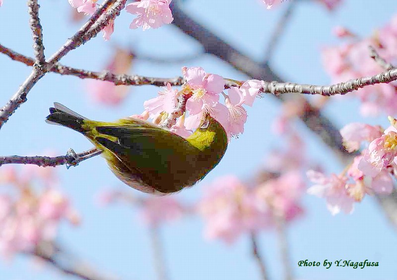この日、河津桜に数羽のメジロが来ていました。